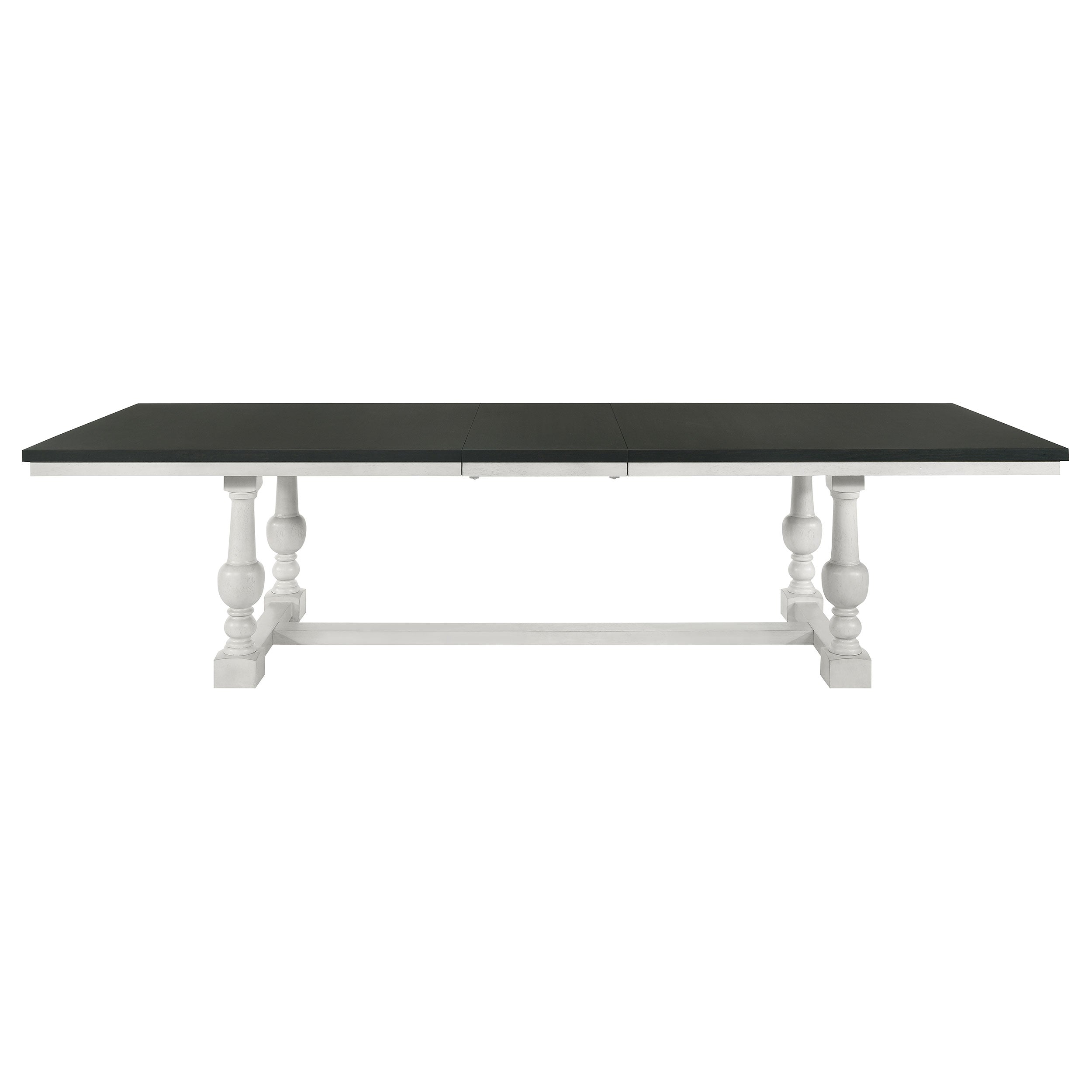 It's easy to imagine sharing delicious meals with family and friends at this stylish, modern five-piece dining set. Featuring a rectangular table with a two-tone finish, the set creates a perfect balance of inviting elegance and easy functionality. An extension leaf is easy to install with cable glides and a locking pin, great for holidays and entertaining, while turned legs and a trestle detail add depth and character in your space. Its charcoal top and vintage chalk white finishes are clean and classic, with matching chairs that add ladder backs and padded seats for excellent comfort. Gray upholstery over foam padding completes each of four side chairs.
