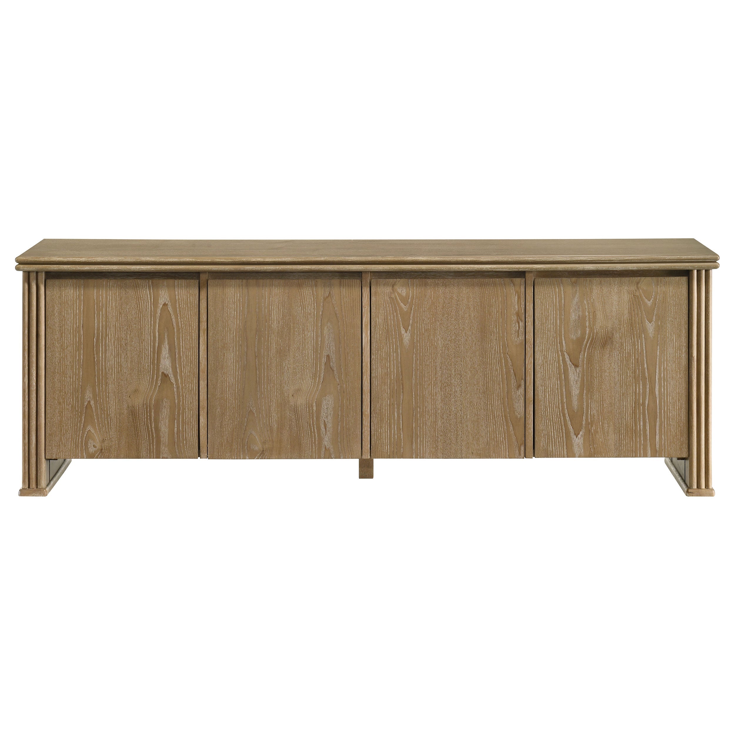 This seventy-inch TV stand combines sculptural texture and functional storage for a grounded living room anchor. Four flat-panel doors conceal generous interior space, complete with fixed shelving and rear cable access cutouts for organized media setup. Vertical reeding along the sides adds visual rhythm to the clean-lined form, while a distressed light brown finish highlights the natural grain. Built from engineered wood and oak veneer, this media console offers both form and utility.