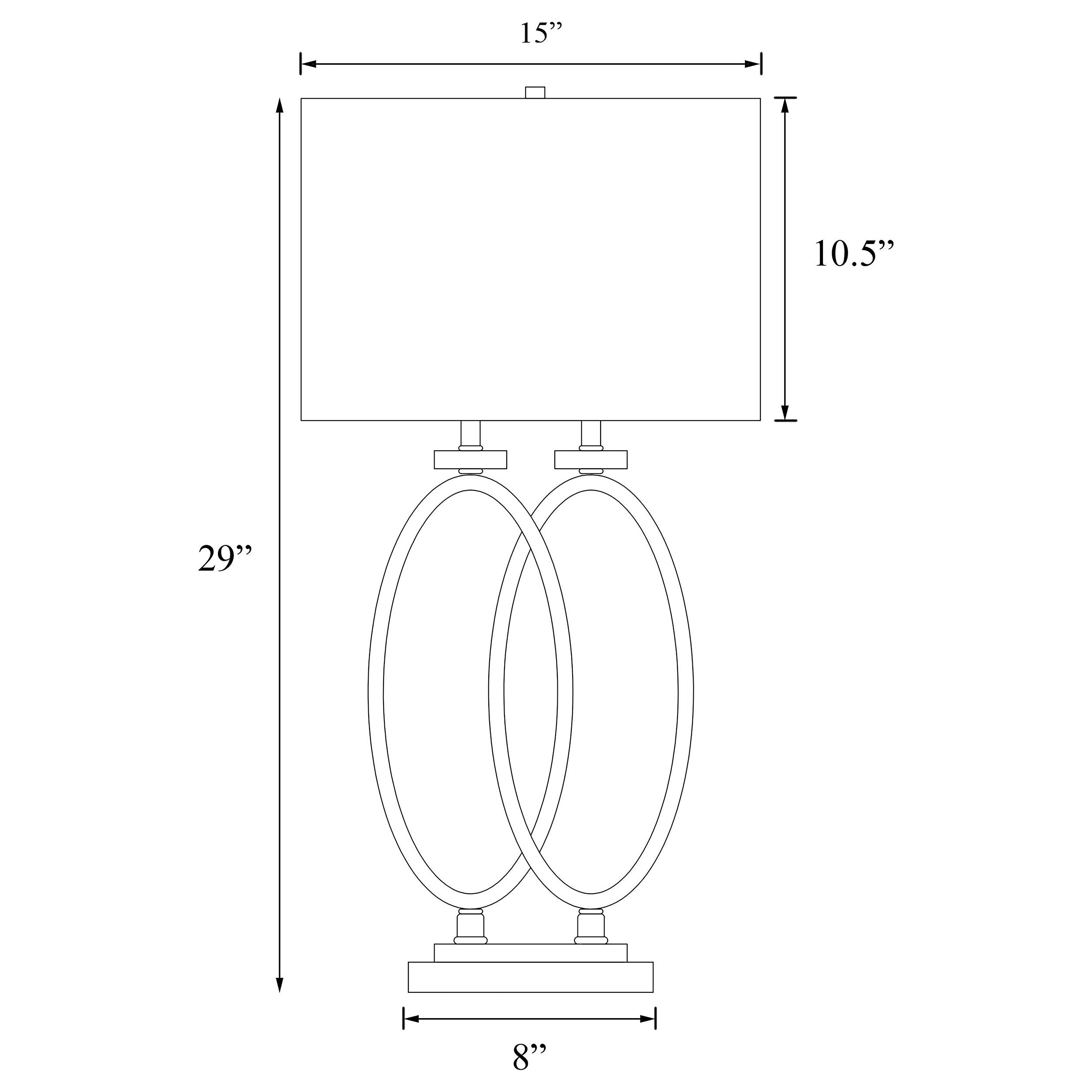 This modern table lamp features a pair of brushed nickel oval rings that float within a crystal-clear base, bringing sculptural balance to any space. Its rectangular fabric shade adds contrast and definition, while the sleek silhouette complements a wide range of contemporary or transitional interiors. Designed for both style and function, this striking accent lamp elevates your living room, bedroom, or home office with a polished presence.