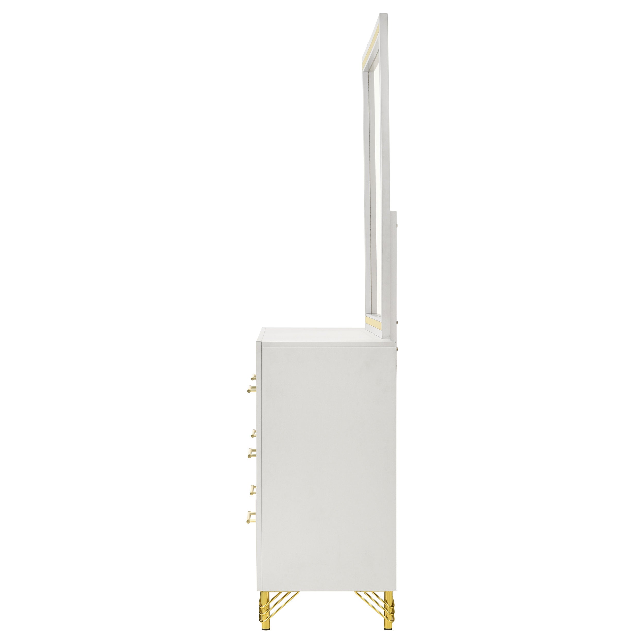 Accentuate surrounding decor with the sophistication of a modern six-drawer dresser. Designed for ample storage, it features a refined look with spacious drawers ideal for everything from clothing to accessories and linens. Its bright white finish is crisp and chic, complemented perfectly with rich, warm gold trim that gleams in the light. Decorative legs have hairpin inspired style, offering a stylish touch of vintage energy. Long bar pulls complete the look with polished perfection.