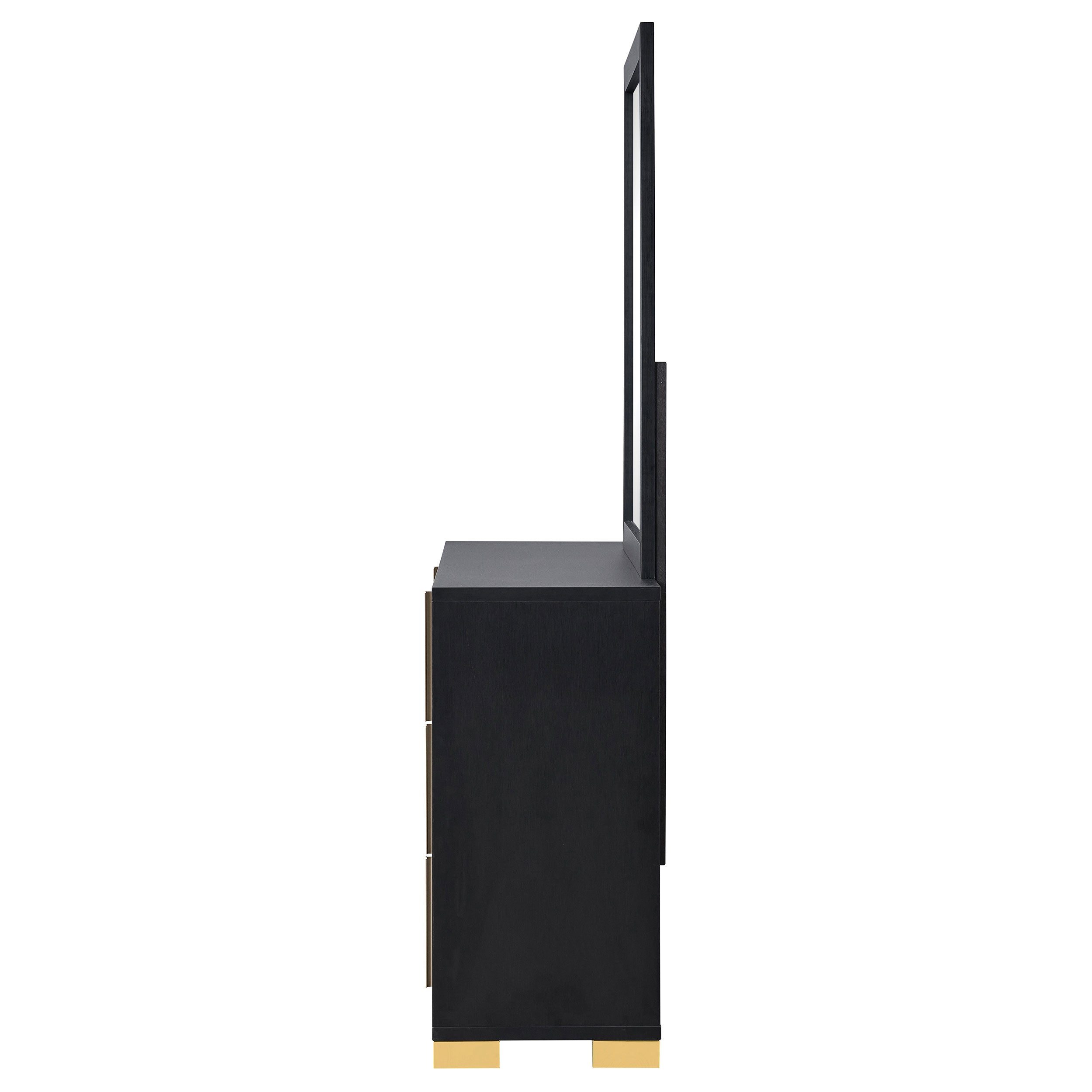 Soak up the sleek and simple yet compelling look of a six-drawer dresser with a dramatic aesthetic that changes the tone of your contemporary bedroom. Modern design details produce a chic vertical dresser with an Art Deco vibe and tons of storage space. Made of wood products, this six-drawer dresser features a versatile finish with glam accenting from gold finish metal, placed carefully to emphasize a geometric linear effect. Store incidentals and accessories in drawers operating smoothly on center metal glides. English dovetail drawer construction embellishes this dresser’s quality, as vertical gold metal drawer hardware offers a unique impact.