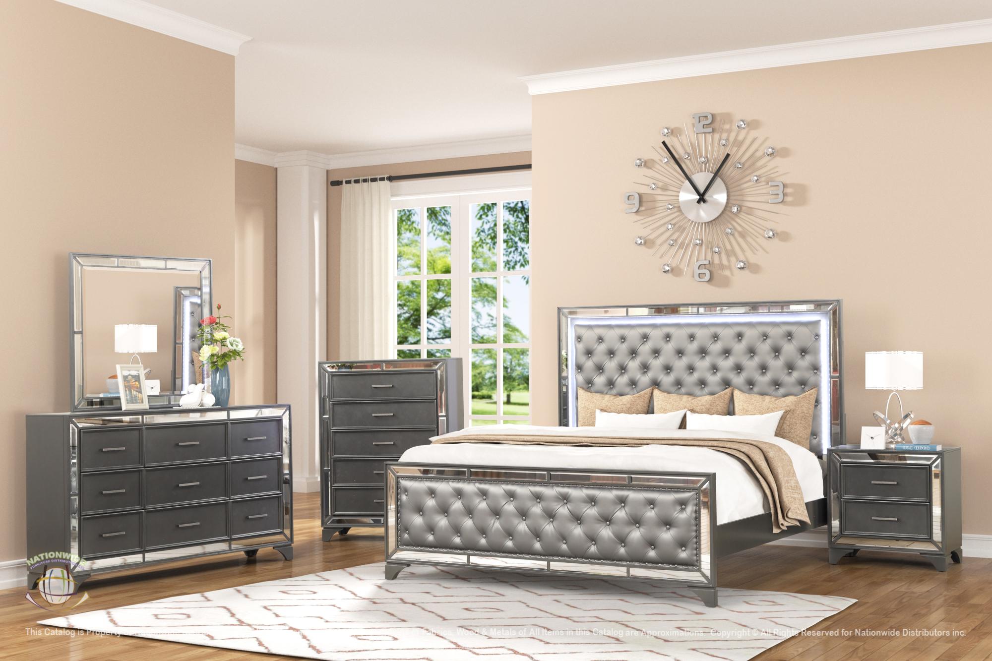 - MODERN STYLE BEDROOM IN A GREY FINISH WITH MIRROR ACCENTS;